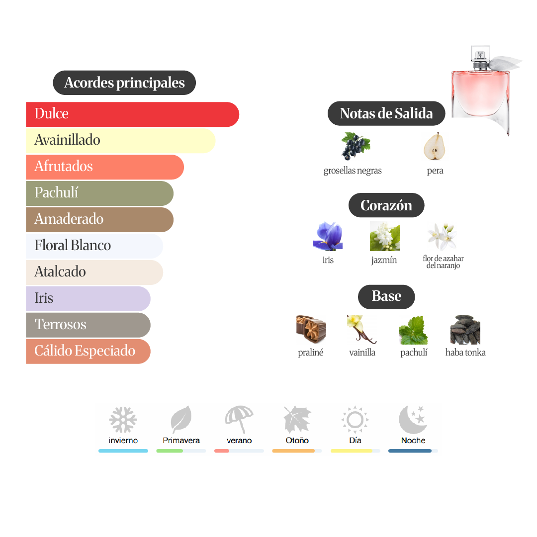La Vie Est Belle de Lancôme es una fragancia de la familia olfativa Floral Frutal Gourmand para Mujeres. Las Notas de Salida: son grosellas negras y pera; las Notas de Corazón: son iris, jazmín y flor de azahar del naranjo; las Notas de Fondo: son praliné, vainilla, pachulí y haba tonka.