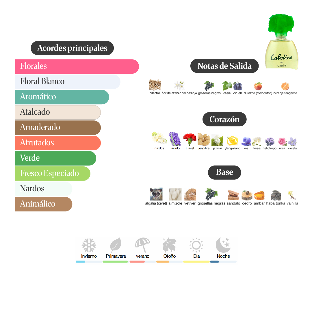 Cabotine de Grès es una fragancia de la familia olfativa Floral para Mujeres. Las Notas de Salida: son cilantro, flor de azahar del naranjo, grosellas negras, casia, ciruela, durazno (melocotón) y naranja tangerina; las Notas de Corazón: son nardos, jacinto, clavel, jengibre, jazmín, ylang-ylang, iris, fresia, heliotropo, rosa y violeta; las Notas de Fondo: son algalia (civet), almizcle, vetiver, grosellas negras, sándalo, cedro, ámbar, haba tonka y vainilla.