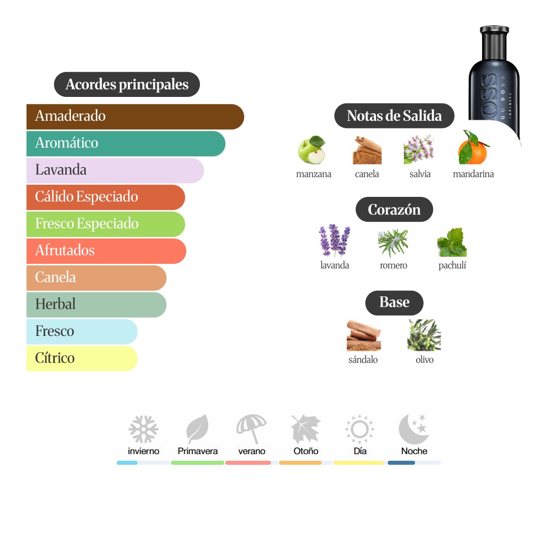 Boss Bottled Infinite de Hugo Boss es una fragancia de la familia olfativa amaderada aromática para hombres. Las Notas de Salida: son manzana, canela, salvia y mandarina; las Notas de Corazón: son lavanda, romero y pachulí; las Notas de Fondo: son sándalo y olivo.