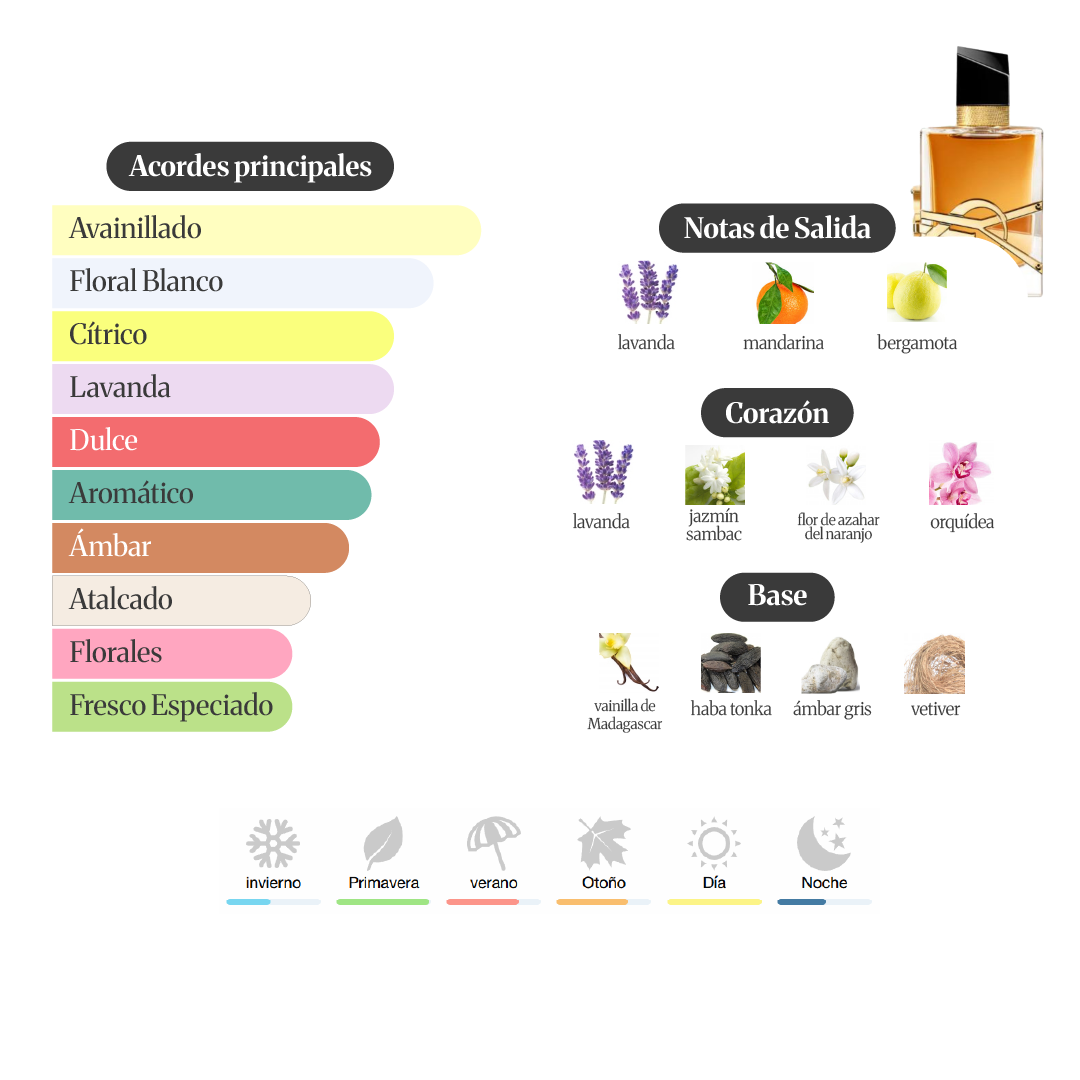 Libre Intense de Yves Saint Laurent es una fragancia de la familia olfativa Oriental Fougère para Mujeres. Las Notas de Salida: son lavanda, mandarina y bergamota; las Notas de Corazón: son lavanda, flor del naranjo tunesino, jazmín sambac (sampaguita) y orquídea; las Notas de Fondo: son vainilla de Madagascar, haba tonka, ámbar gris y vetiver.