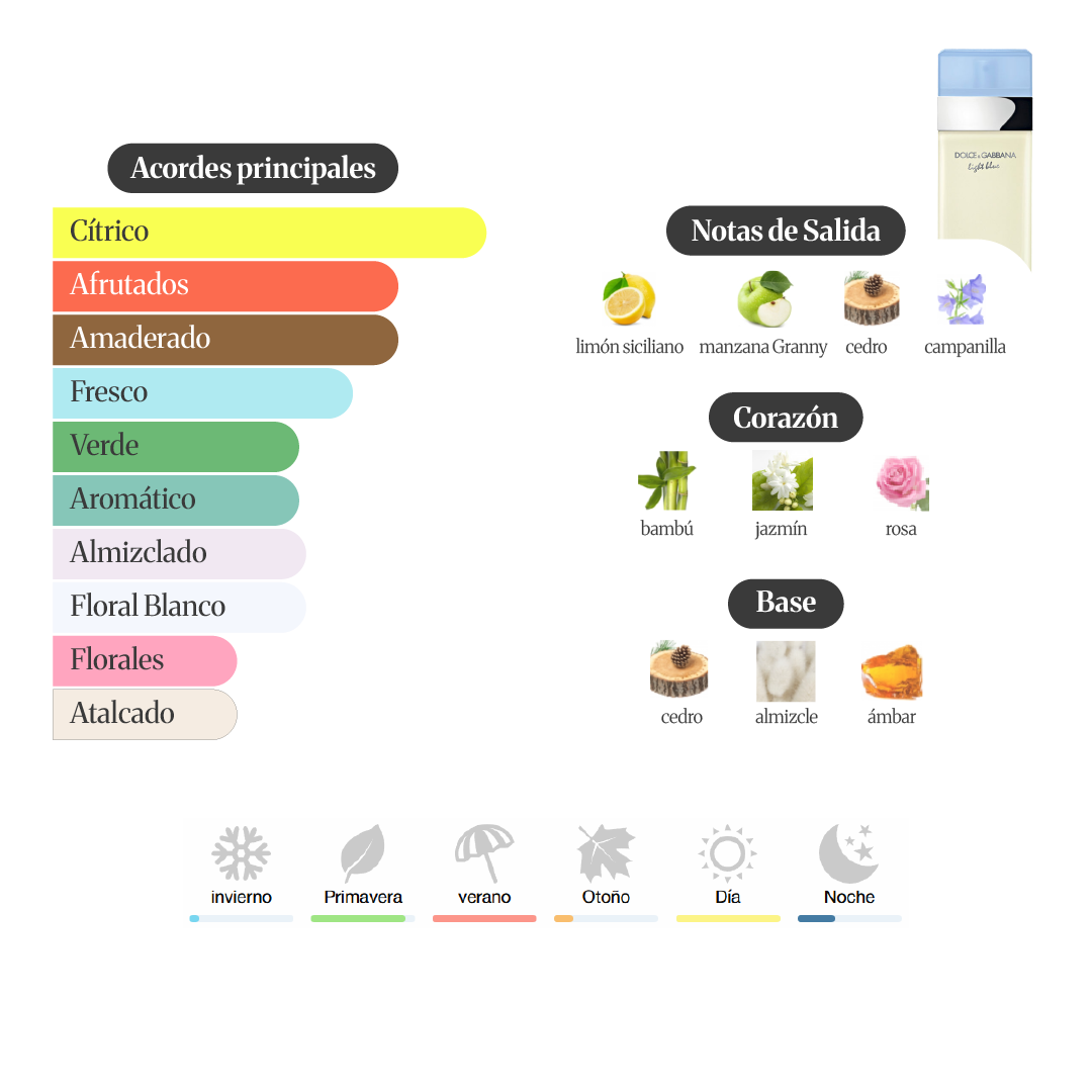 Light Blue de Dolce&Gabbana es una fragancia de la familia olfativa Floral Frutal para Mujeres. Las Notas de Salida: son limón siciliano (lima siciliana), manzana, cedro y campanilla; las Notas de Corazón: son bambú, jazmín y rosa blanca; las Notas de Fondo: son cedro, almizcle y ámbar.
