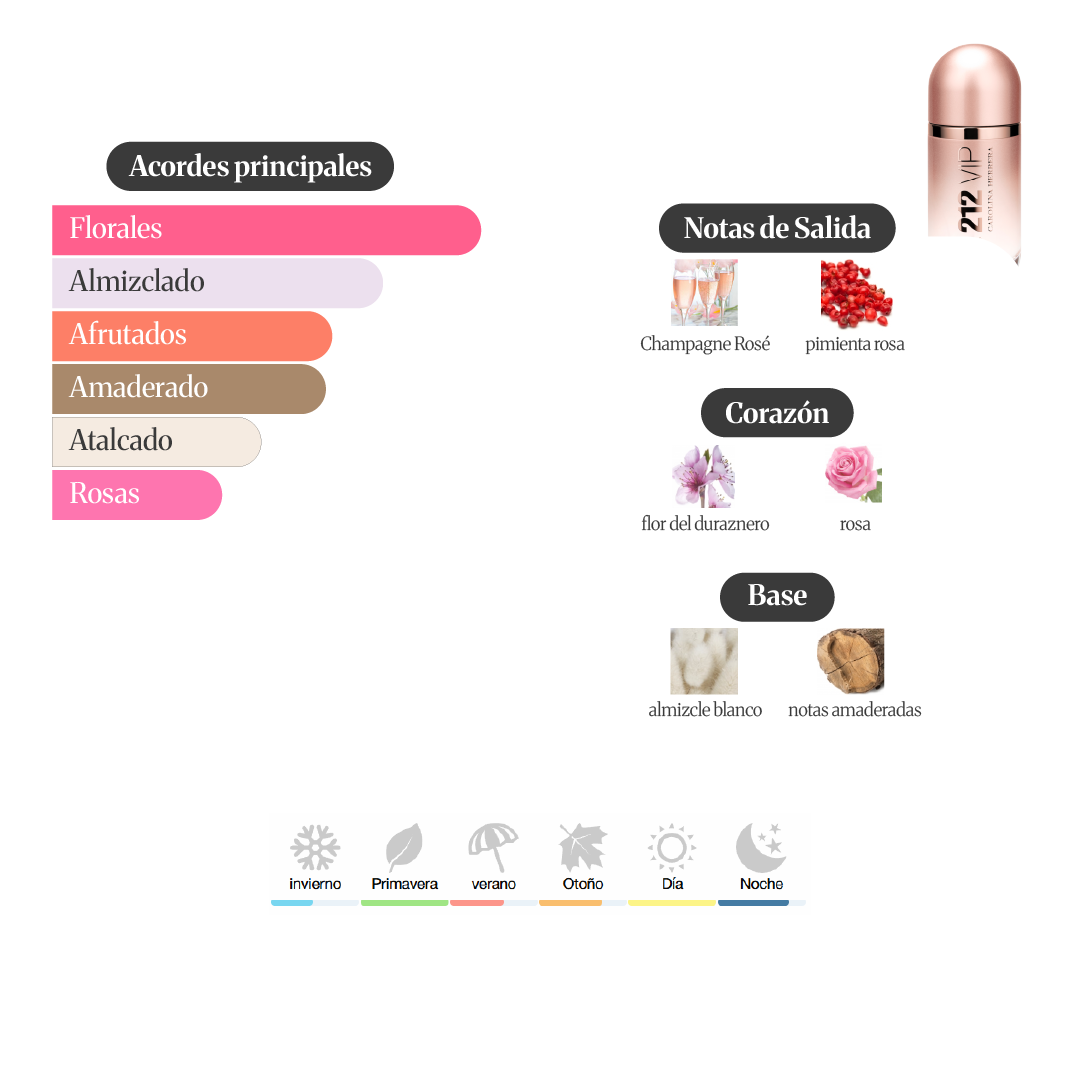 212 VIP Rosé de Carolina Herrera es una fragancia de la familia olfativa Floral Frutal para Mujeres. Las Notas de Salida: son Champagne Rosé y pimienta rosa; las Notas de Corazón: son flor del duraznero (flor del melocotonero) y rosa; las Notas de Fondo: son almizcle blanco y notas amaderadas.