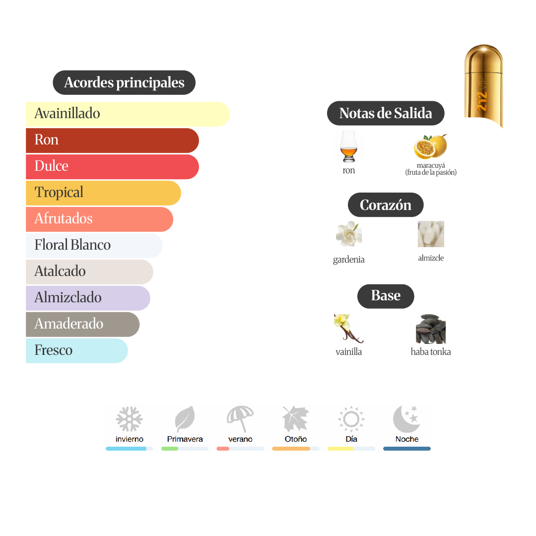 212 VIP de Carolina Herrera es una fragancia de la familia olfativa Oriental Vainilla para Mujeres. Las Notas de Salida: son ron y maracuyá (fruta de la pasión); las Notas de Corazón: son gardenia y almizcle; las Notas de Fondo: son vainilla y haba tonka.